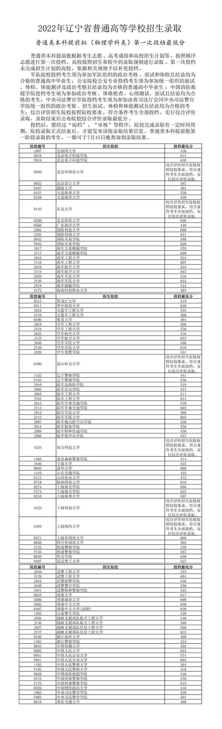 7月12日省招考办公布了2022年辽宁省普通高等学校招生录取普通类本科提前批第一次投档最低分,历史学科类最高为北京大学655分,物理学科类最高为清华大学680分。考生一般可于7月15日晚查询到所有提前批院校录取结果。