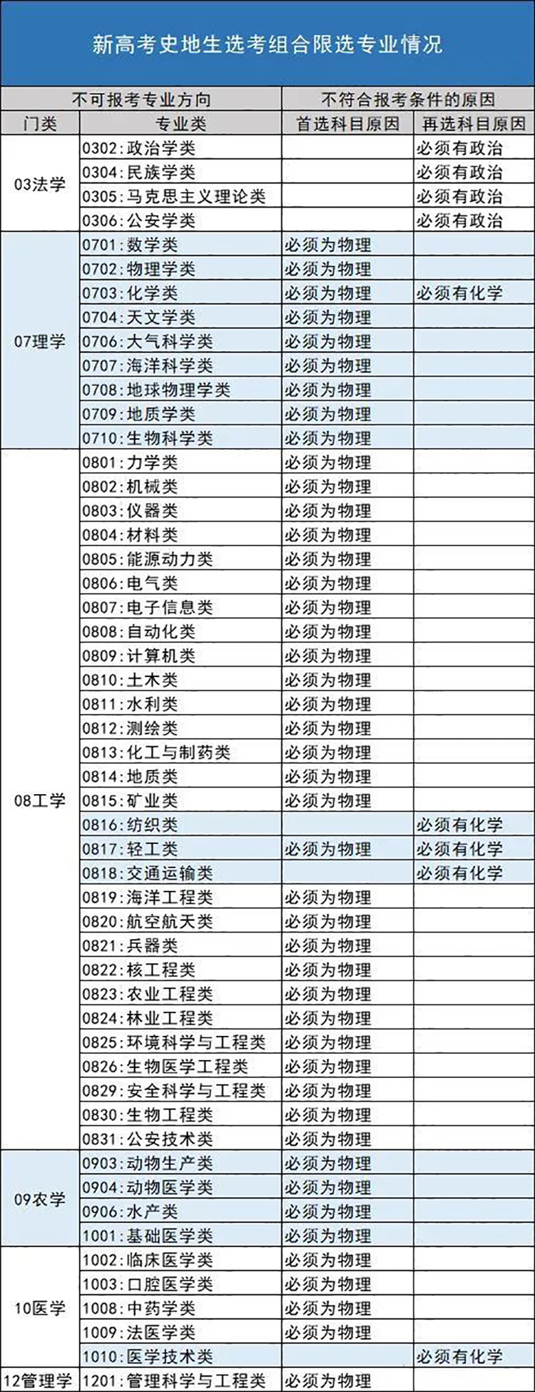 限选科目:法学门类下的政治学类、民族学类、马克思主义理论类、公安学类专业与物化生一样,不能报考。