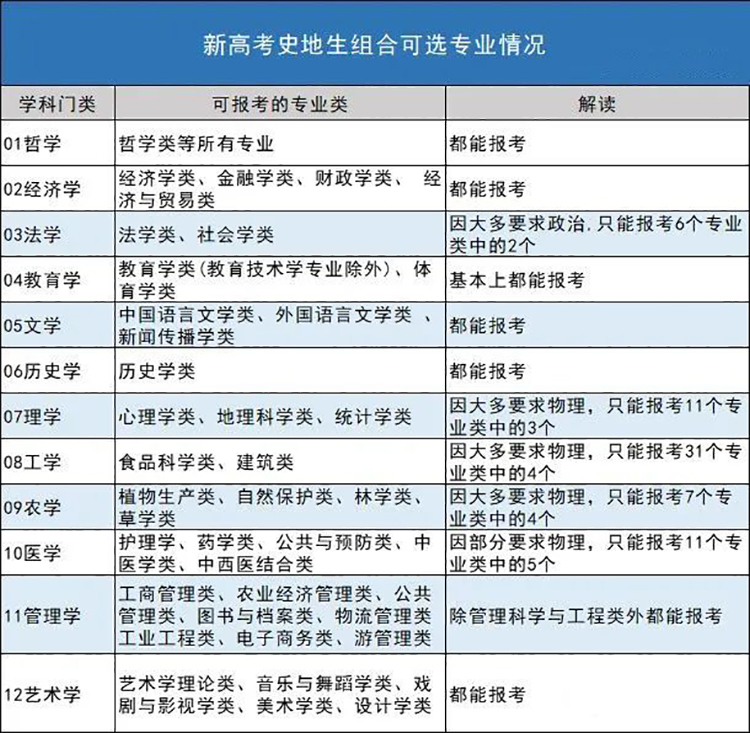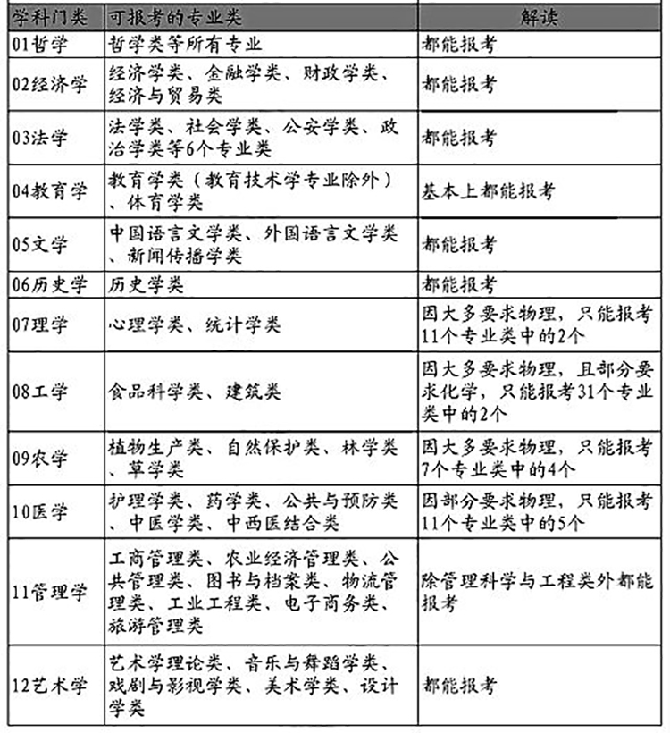 可选专业范围:该组合报考哲学、经济学、法学、教育学、文学、历史学、管理学、艺术学8门类下的相关专业基本上不受限制。