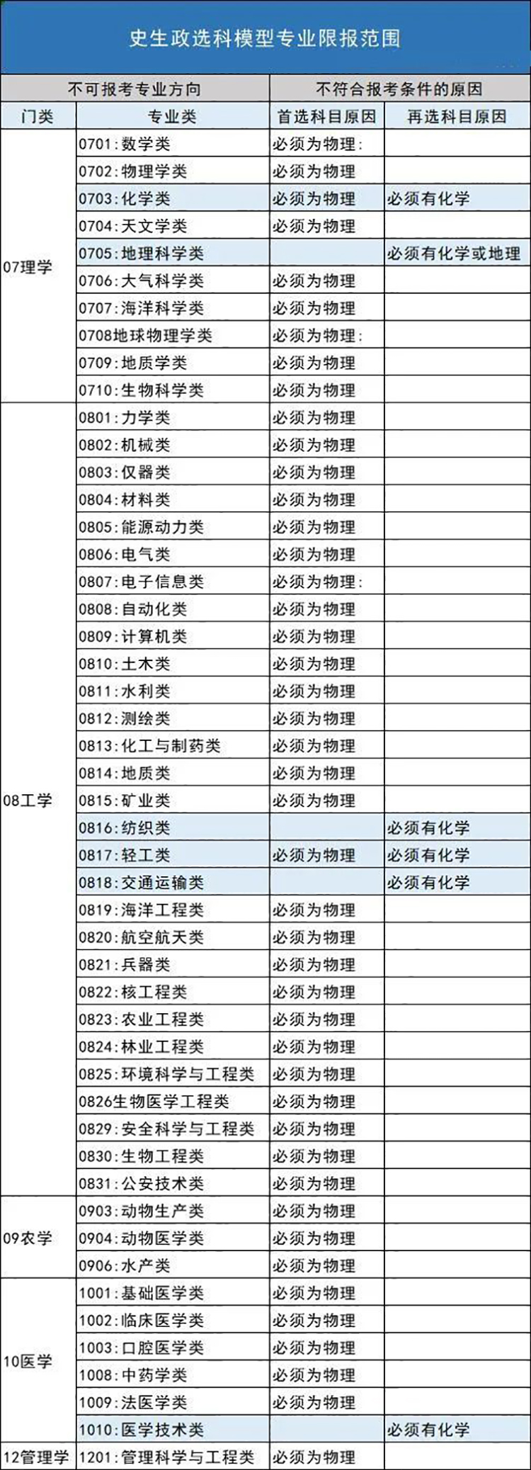 限选科目:对化学、生物要求严格的生物科学类、化学类、医学类专业,工学里的纺织类、轻工类,农学中的植物生产类、自然保护与环境生态类、草学类等。