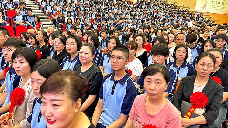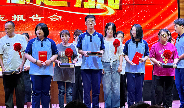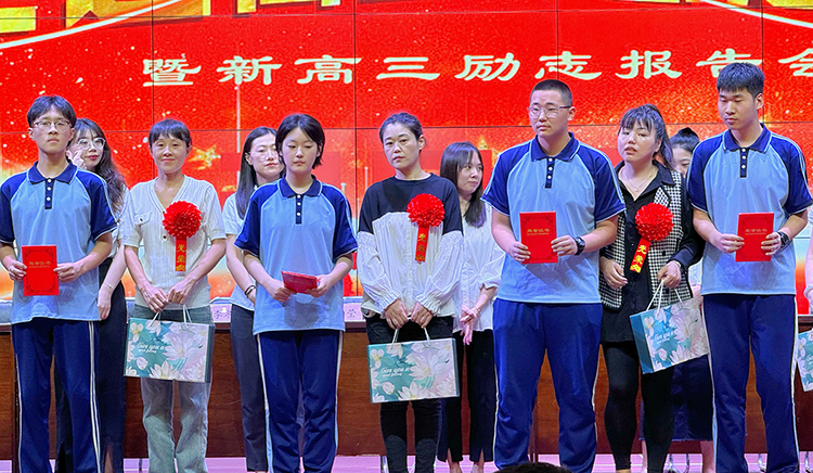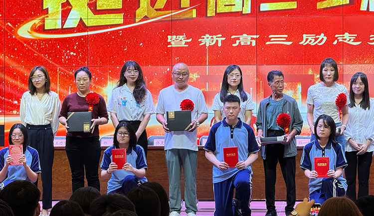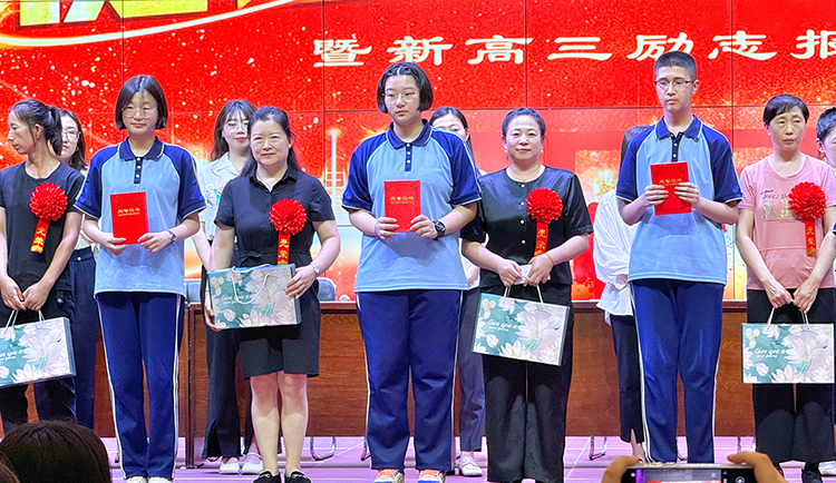 第一项由各年部主任公布了获奖学生名单,为获奖学生家长佩戴大红花,所有高三教师和学子共同见证了他们的荣耀时刻。